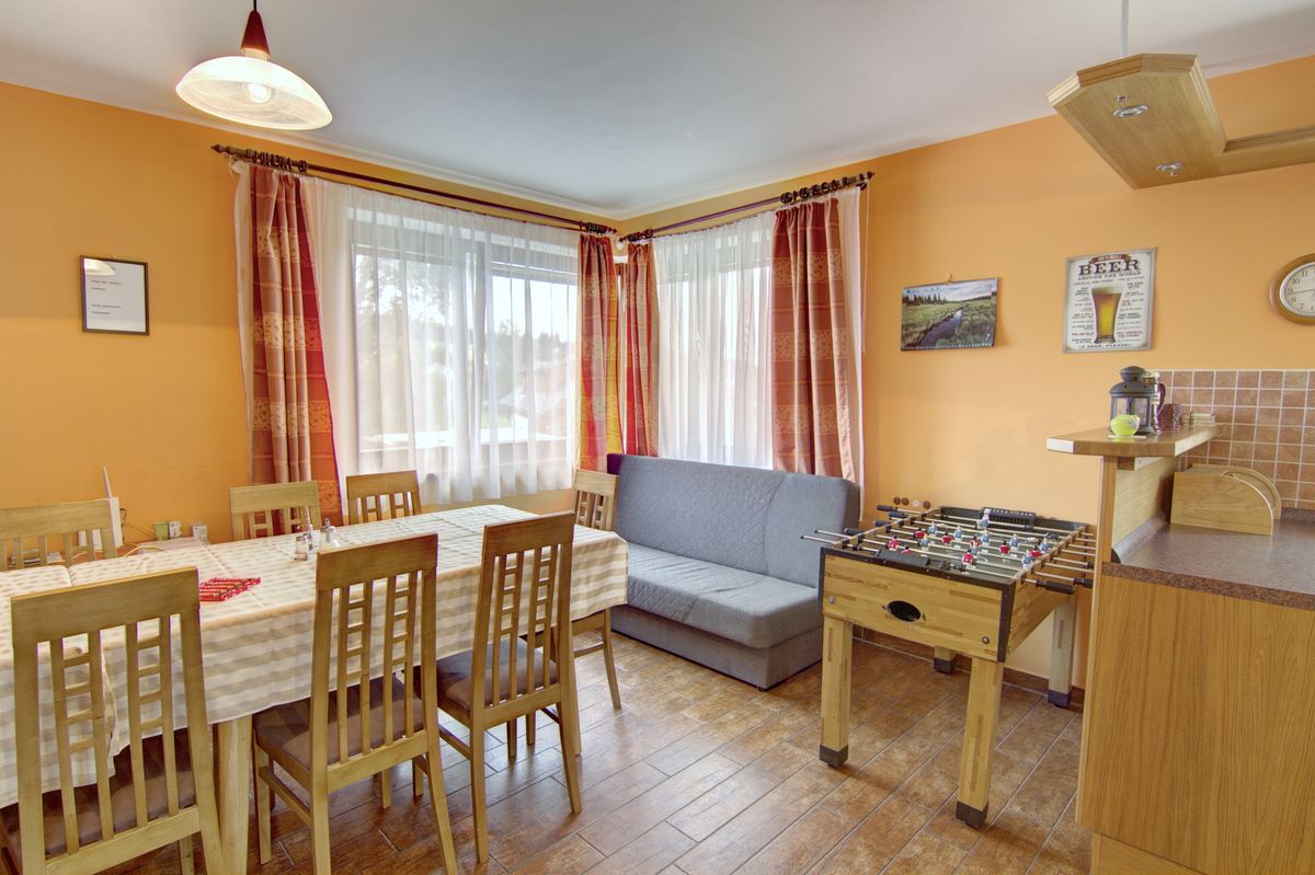 Středobodem chalupy je společenská místnost s kachlovými kamny, velkým jídelním stolem a kuchyňskou linkou. Každý apartmán má přístup do vlastní ledničky a k vlastnímu kuchyňskému vybavení (varná konvice, příbory, nádobí).